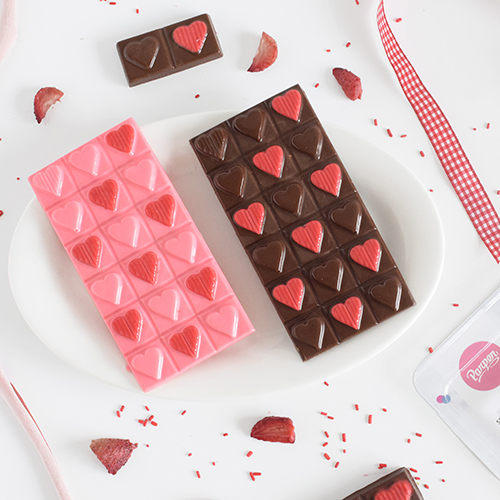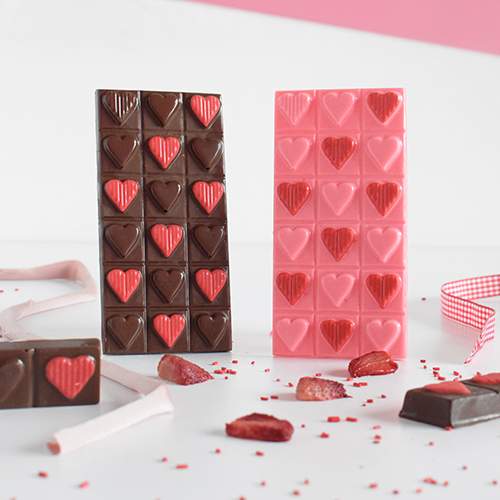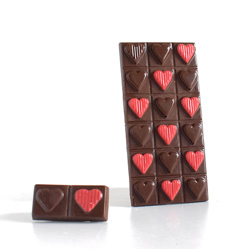 Set de 2 moldes placas, para crear tableta y tableta bombón de corazones lisos y rayados en chocolate.