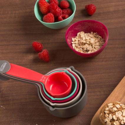 El conjunto perfecto para seguirte en la cocina. Incluyendo cinco tazas de medir coloridas de 1/8, 1/4, 1/3, 1/2 y 1 taza, este juego de diseño original de Trudeau no contiene BPA y es apto para lavavajillas.